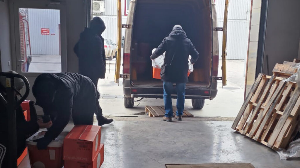 Emergency medical shipments from Direct Relief arrive at a distribution center located in central Ukraine on March 15, 2022. The shipment went to the Ukrainian NGO Charity Fund Modern Village and Town, which distributed the medical aid to communities on the frontlines of the conflict. Tuesday’s shipment included field medic backpacks, inhalers, essential medicines, oxygen concentrators and personal care items for people displaced by the war. (Photo courtesy of Charity Fund Modern Village and Town)