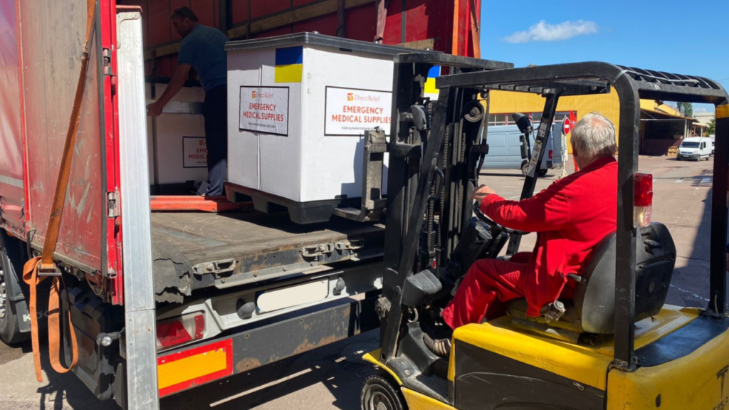 An aid delivery being made by the organization AICM in Ukraine. Deliveries of medical aid into conflict areas of Ukraine have been pivotal to supporting the health system during the war. (Photo courtesy of AICM)