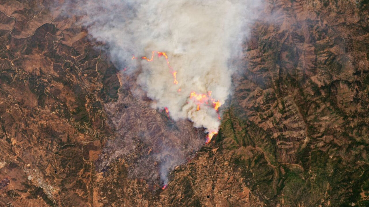 Satellite image of the Oak Fire and its burn scar, July 24, 2022, the Nasa Earth Observatory.