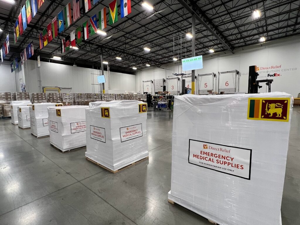 Emergency medical aid is staged in Direct Relief’s warehouse for shipment to Sri Lanka on July 27, 2022. (Maeve O’Connor/Direct Relief)