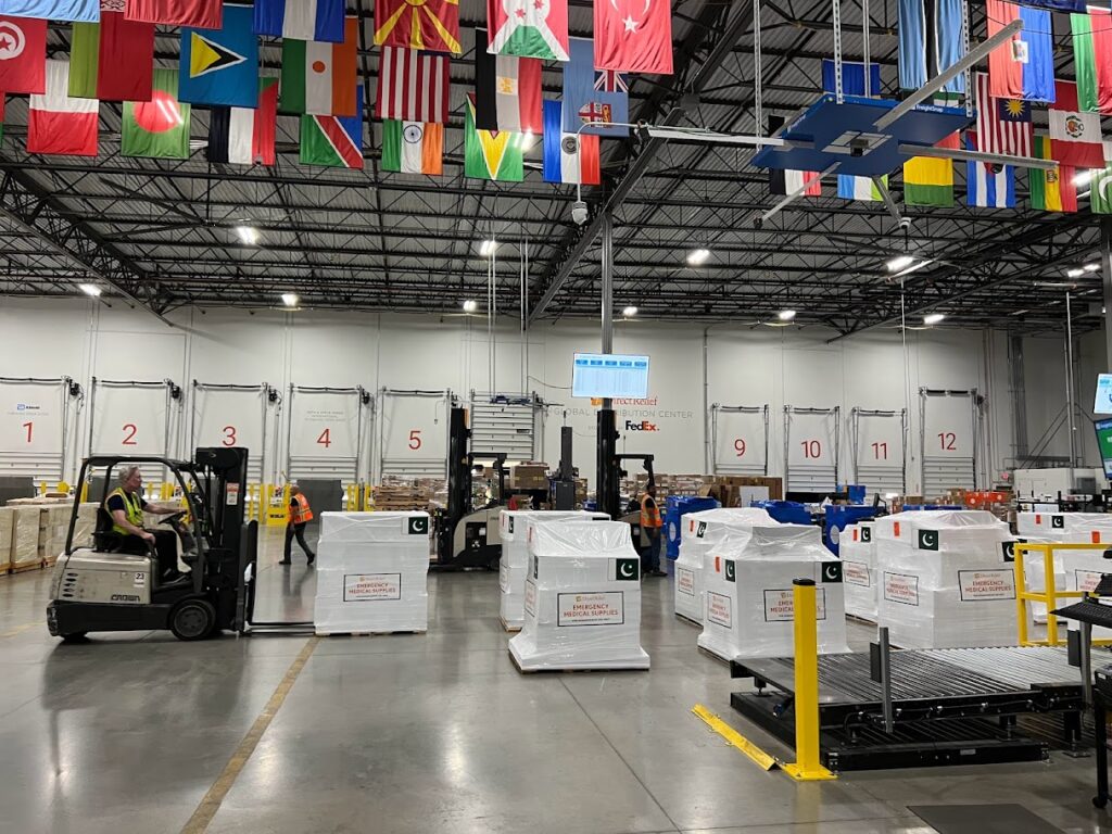 A 23-pallet emergency shipment to the Medical Directorate of Pakistan is packed in Direct Relief’s warehouse in Santa Barbara, California on September 13, 2022. The donation contains chronic care medications, trauma care supplies, hygiene kits, birth control, anti-seizure medications, PPE, and prenatal vitamins. These supplies will be distributed to public health facilities providing care to the 33 million people that were impacted by the widespread flooding. (Maeve O’Connor/Direct Relief)