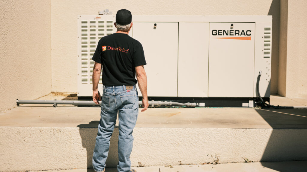 Direct Relief’s Tom Roane inspects a generator that was donated by Direct Relief at Neighborhood Health Center in Naples, Florida on Monday, October 3, 2022. The generator allowed power to stay on in the clinic, protecting temperature-sensitive medications. (Zack Wittman for Direct Relief)