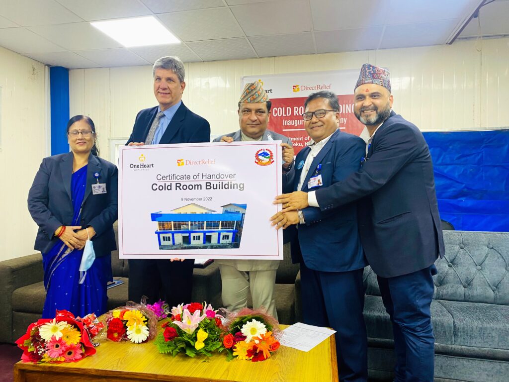 The handover of a new cold storage room, funded by Direct Relief, between One Heart Worldwide, which coordinated the construction project, and Nepal’s Ministry of Health and Population. The cold storage room will be used for temperature-sensitive therapies, including vaccines. (Courtesy photo)