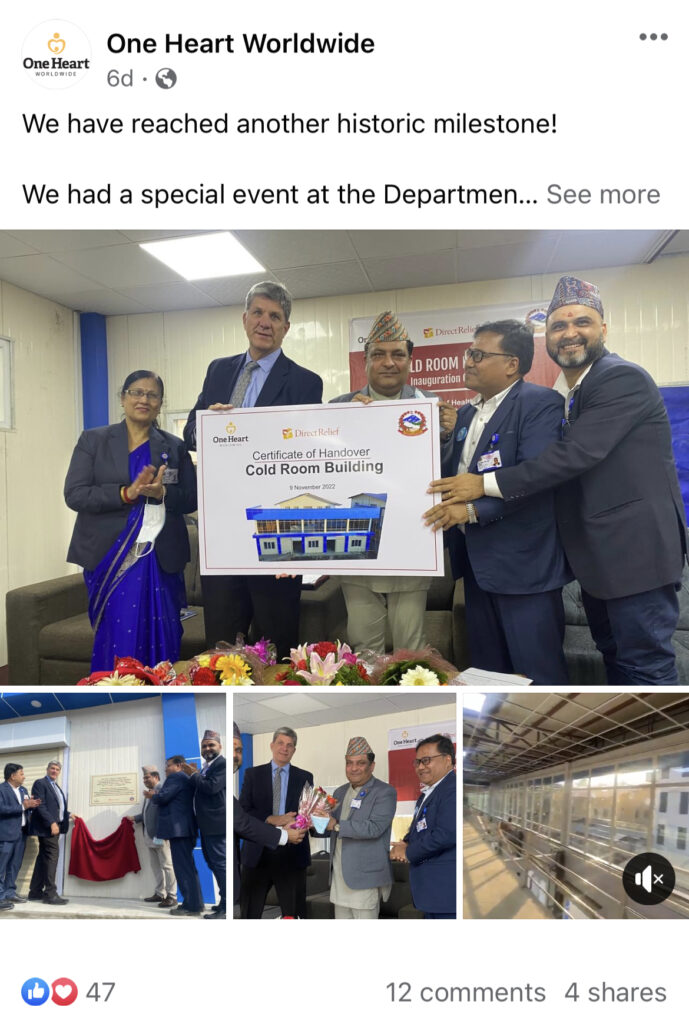 The donation highlighted a critical need for expanded cold storage in the country, and Direct Relief committed $275,000 to build a dedicated cold chain building on behalf of the Ministry, complete with solar backup power. A handover occurred last week between local NGO One Heart Worldwide, a group that organized the construction project, to officials from the Ministry of Health and Population.