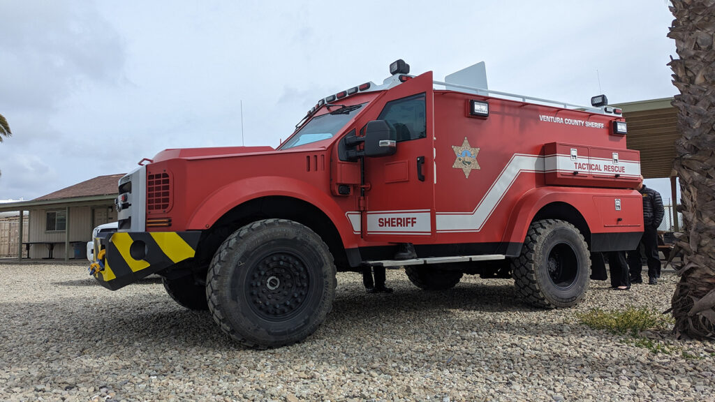 A high-water rescue vehicle donated by Direct Relief for the California Office of Emergency Services (CalOES), which is responsible for SAR units in Ventura, Santa Barbara, and San Luis Obispo Counties, was unveiled on Feb. 21, 2023. This vehicle will be a shared resource among the three units. (Tony Morain/Direct Relief)