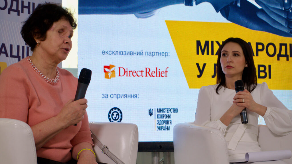 Unbroken patient Olena Svitlova (left) shares her story. (Alexey Shivrin/Direct Relief)
