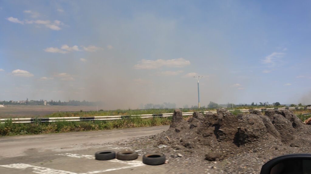 Smoke from shelling drifts across the approaches to Antonivka, Kherson region, June 9, 2023. (Nick Allen/Direct Relief)