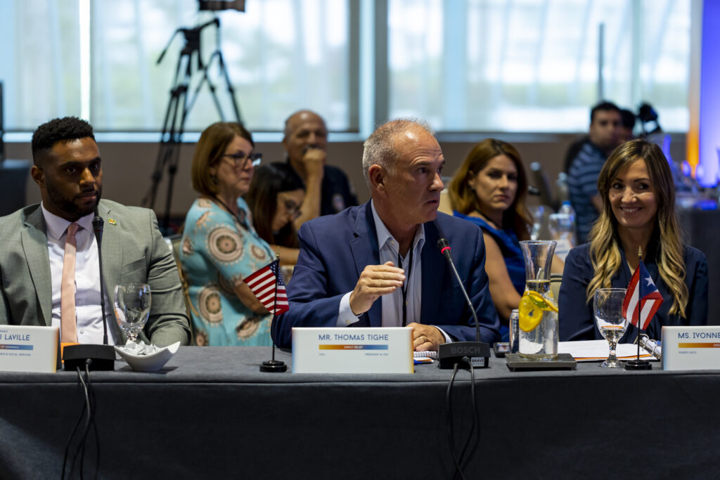 Direct Relief CEO Thomas Tighe (center) speaks with healthcare officials and representatives of Caribbean nations at the Caribbean Resilient Summit in Puerto Rico.