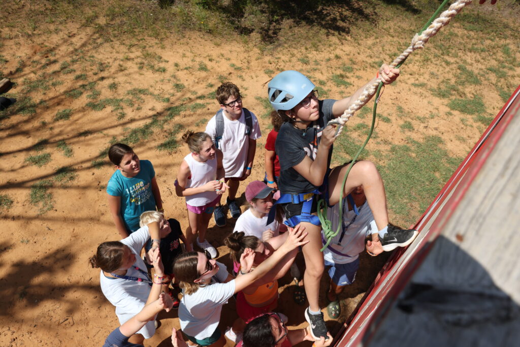 Staff and campers help a friend with the climbing wall at Camp Sweeney. (Courtesy Photo)