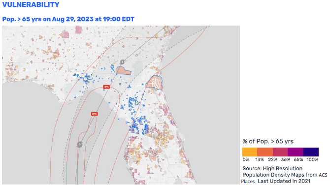 CrisisReady, a joint effort of Harvard University and Direct Relief, is creating situation reports to inform relief efforts. These reports analyze anonymized and aggregated data on the movement of Facebook users to track changes in population densities, highlighting displacement in affected areas of Florida. They also contain information about baseline population vulnerabilities and local healthcare infrastructure, such as facilities, outpatient centers, and hospitals.