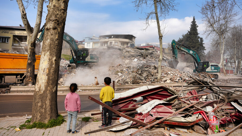 Children watch work on a collapsed building site after a powerful earthquake in Maras, Turkey, in February 2023. (Photo by Baran Ozdemir for Direct Relief)