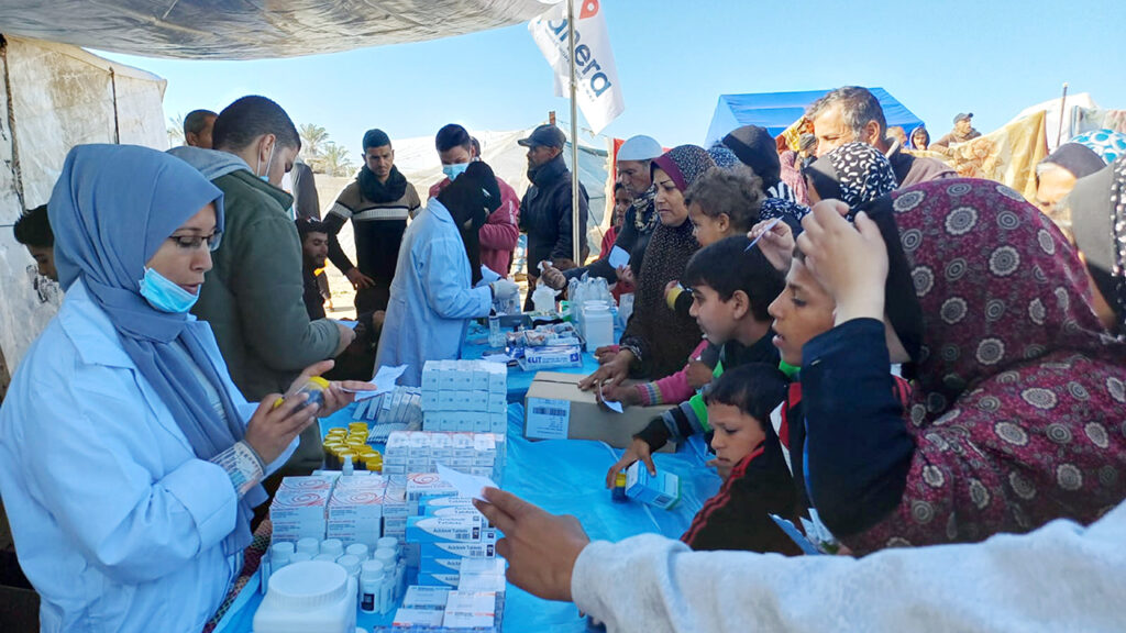 Health providers with Anera conduct mobile health outreach in Gaza in January 2024. The mobile clinics are designed to provide a comprehensive range of medical services, including general healthcare, gynecology, dermatology, pediatrics, internal medicine, and psychological support. Direct Relief supported these efforts with medications and supplies, as well as financial support. (Photos courtesy of Anera)