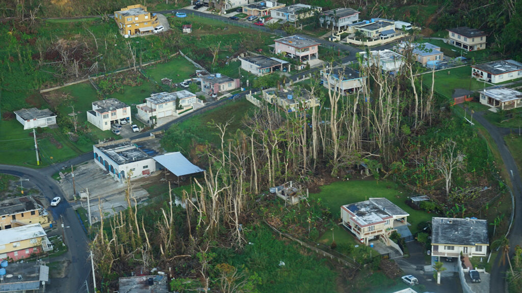Damage from Hurricane Maria as seen from a helicopter above the community of Utuado in October 2017. (Lara Cooper/Direct Relief)