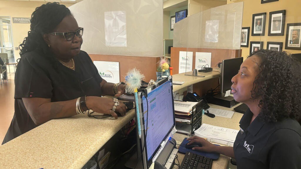 Nesita Bishop of Roanoke Chowan Community Health Center works with a coworker to coordinate patient needs. (Photo courtesy of RCCHC)