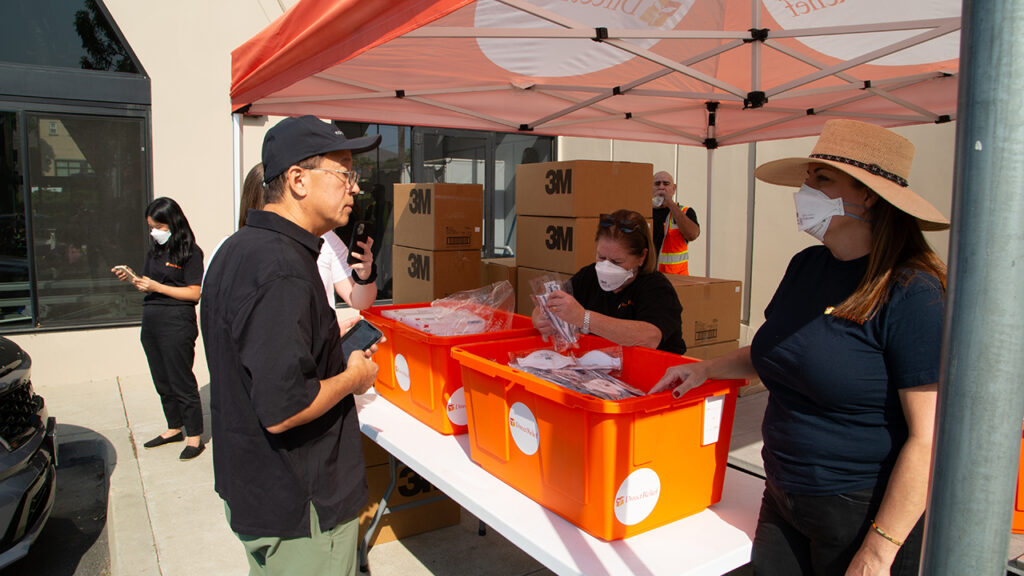 Direct Relief staff deliver N-95 respirators for Ventura County residents dealing with air quality impacts from the Mountain Fire, a wildfire that had forced thousands to evacuate areas of Ventura County, California, on Nov. 7, 2024. Staff also delivered other medical aid and personal care products, such as shampoo, soap, and dental hygiene items for people displaced from their homes by the fires. (Photo by Adam Courier for Direct Relief)
