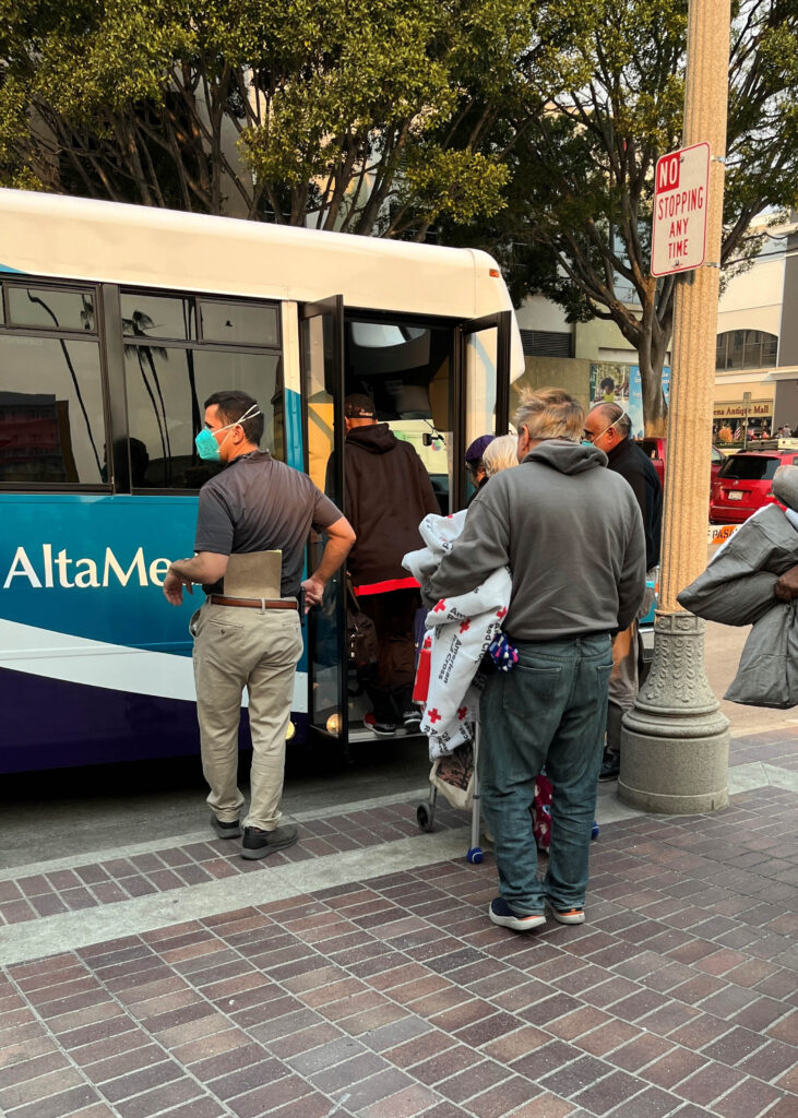A patient receives transportation from the Pasadena Convention Center during the wildfires. (Photo courtesy of AltaMed)