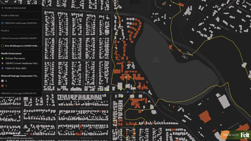 Another 51 structures were determined to have “Minor” or “Major” damage, of between 10% to 50% of the structure. Ground assessment areas were also clustered around the fire perimeter, predominantly at the edge where the probability of damage and likelihood of detection was greatest. While this makes sense in terms of prioritization for the work of ground crews, the clustering also left large areas within the perimeter but further away from the edge largely unassessed. Likewise, the principal health infrastructure serving areas within the Eaton Fire perimeter was entirely unassessed by this process as of January 13, most likely due to the prioritization landscape.
