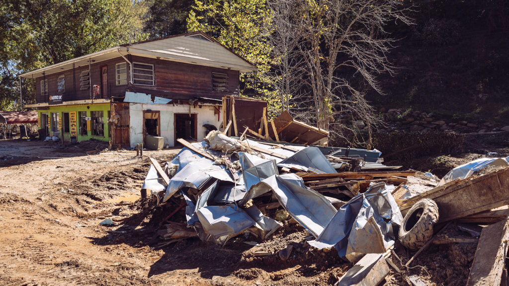 Hurricane Helene’s damage as seen in Burnsville, North Carolina, in the weeks following the storm. Five months later, the region is continuing to recover. (Photo by David Uttley for Direct Relief)