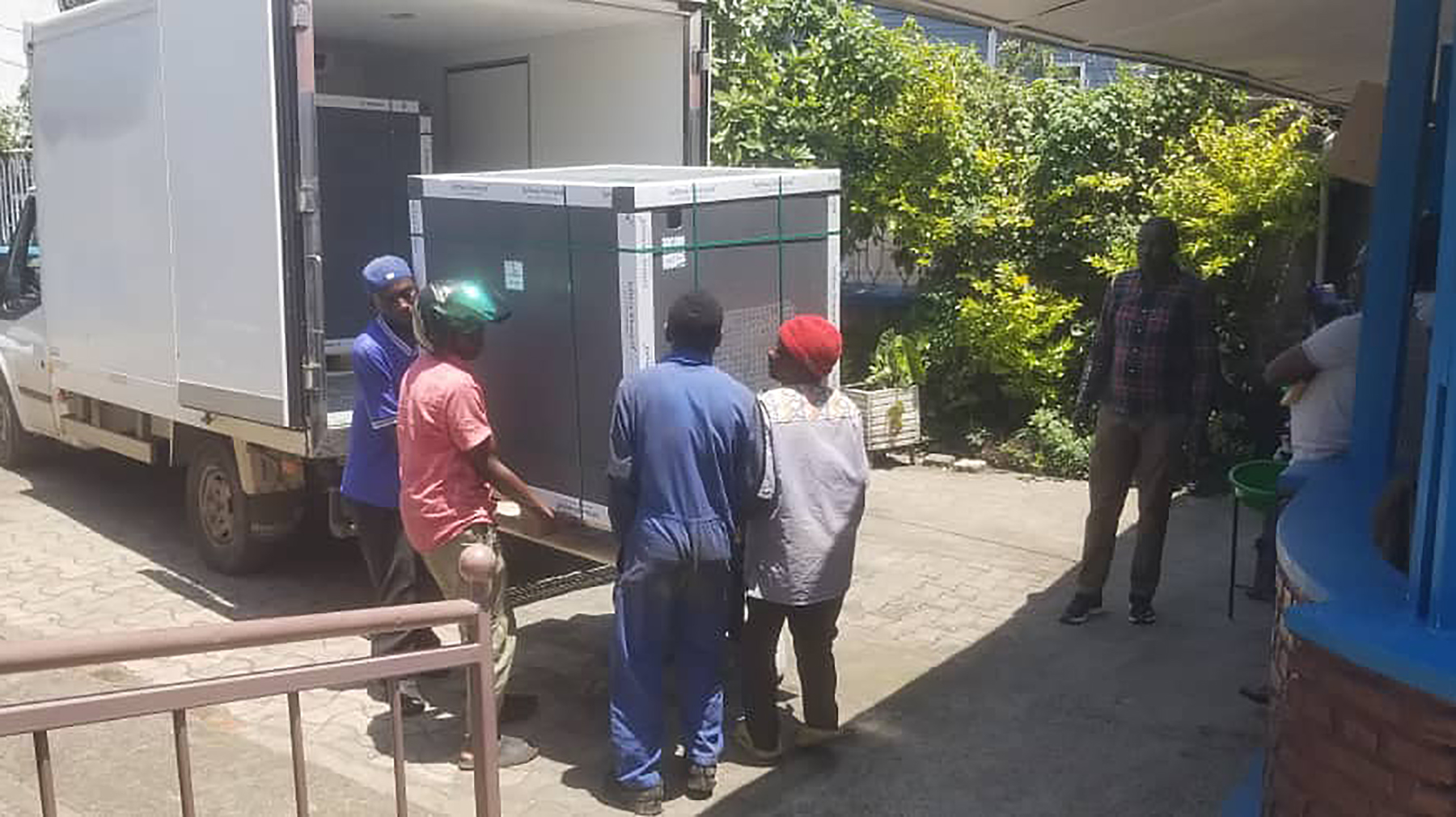 A Direct Relief shipment of temperature-sensitive medications is unloaded at ADIC’s Goma clinic. (Photo courtesy of ADIC)