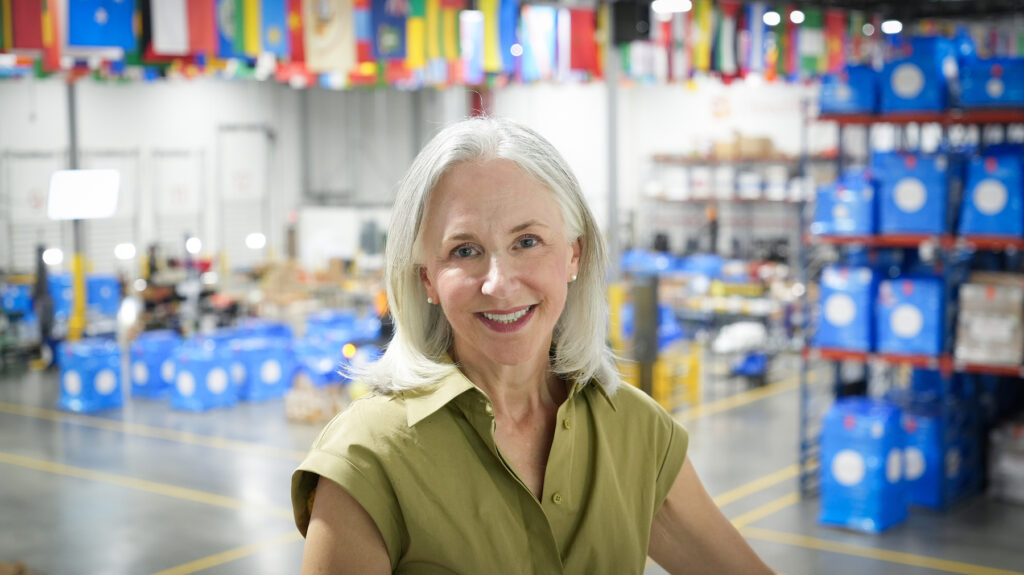 Direct Relief CEO Amy Weaver on May 5, 2025, in Direct Relief’s warehouse in Santa Barbara, California. (Lara Cooper/Direct Relief)