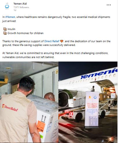 Insulin and other medical aid from Direct Relief recently arrived in Yemen to support health services in the country.