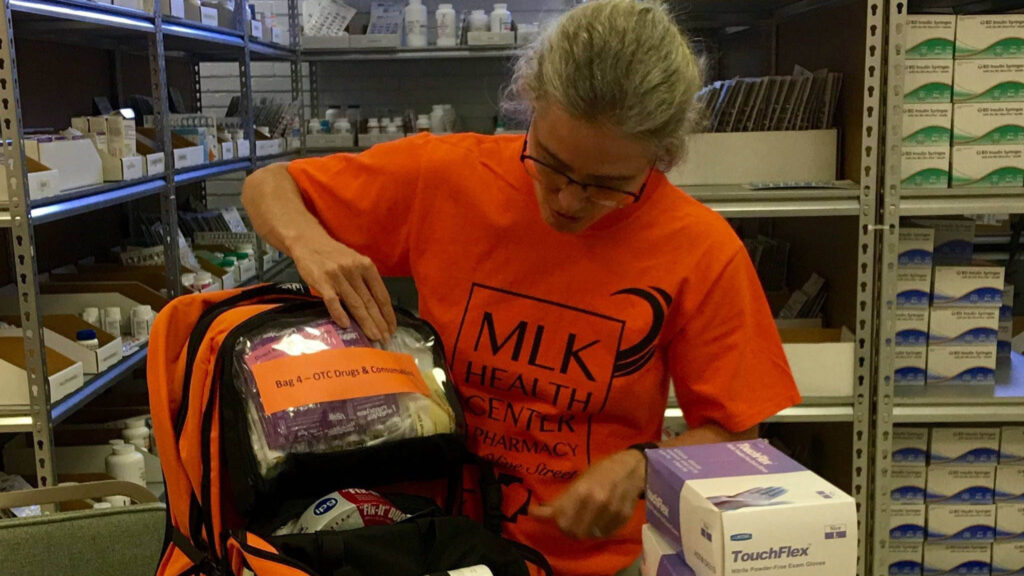 An MLK Health staff member prepares to deploy a Direct Relief emergency medic pack in the aftermath of Hurricane Harvey in 2017. The health center was a critical first responder during Hurricane Katrina and subsequent storms. (Photo courtesy of MLK Health)