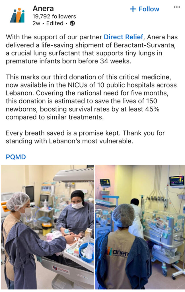 A critical medication for infants who need respiratory support has arrived at 10 hospitals in Lebanon. Nonprofit Anera has delivered Beractant-Survanta, a critical lung surfactant for premature infants born before 34 weeks, to the NICUs of 10 public hospitals across the country.
