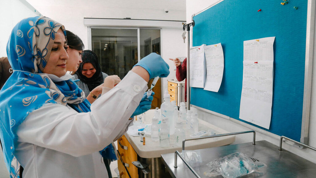 Staff prepare medications at Hiwa Cancer Hospital, the only specialized cancer hosital in Iraqi Kurdistan, and the second-largest provider of cancer care in all of Iraq. In partnership with Kurdistan Save the Children, a donation of requested chemotherapy medicine from Direct Relief was delivered to the hospital in January 2019. (Photo courtesy of Kurdistan Save the Children)