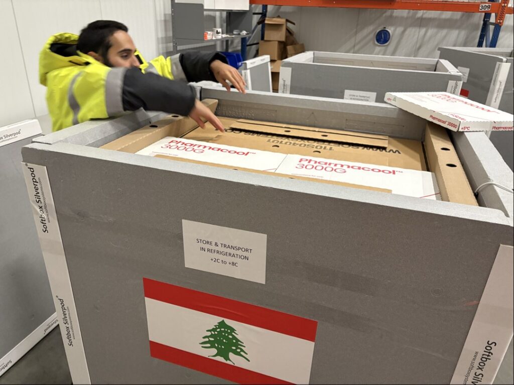A man in a yellow and black coat reaches into a tall gray shipping container filled with cardboard packaging and marked with "Store and Transport in Refrigeration +2C to +8C" and the Lebanese flag.