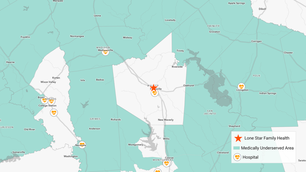 Lone Star’s Huntsville location lost two providers within the last three years. The location sits within a Health Professional Shortage Area by HRSA, or an area where there is a shortage of primary care, dental, and mental health providers. When news broke of the Trinity hospital closure, Lone Star expected an influx of patients and hired a third provider to support behavioral health needs.