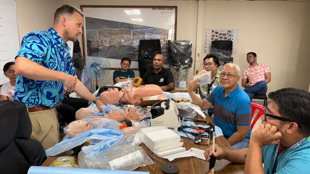 Healthcare providers in the Marshall Islands take part in emergency response training, including simulation-based instruction using medical equipment provided during a Direct Relief-supported mission. (Photo courtesy of Pacific Health Partners)