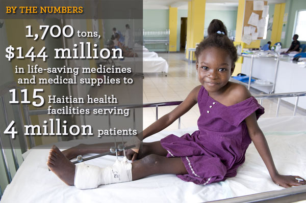 - $4.6 million to mobilize, warehouse, and deliver more than 1,700 tons of life-saving medical resources valued at more than $150 million (wholesale) to 186 community-based health facilities throughout the country (using a state-of-the-art, commercial-grade IT backbone, Direct Relief created the only charitable online ordering platform for Haitian healthcare providers to efficiently order and receive medications and supplies at no cost to them.)