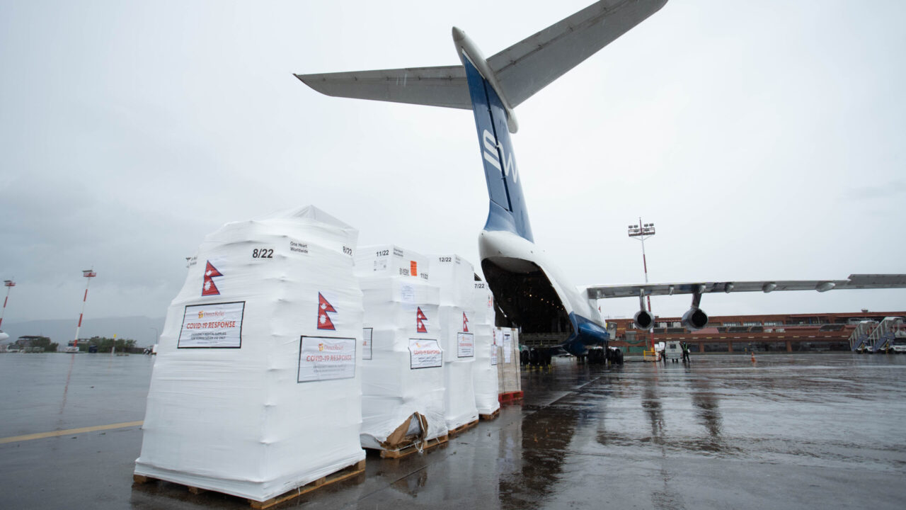 A 25-ton shipment of medical aid including 860 Direct Relief-purchased oxygen concentrators arrived via air charter in Kathmandu, Nepal on Fri. May 28, 2021 amid a surge in Covid-19 cases.(Photo: Pranjal Sharma/Direct Relief)