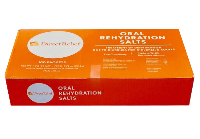 Highly requested in times of outbreak or emergency, oral rehydration salts (ORS) are essential treatments for people suffering dehydration from diarrhea and other ailments. Direct Relief’s ORS is an oral powder—one packet’s contents are dissolved in a liter of water—made to WHO recommendations.